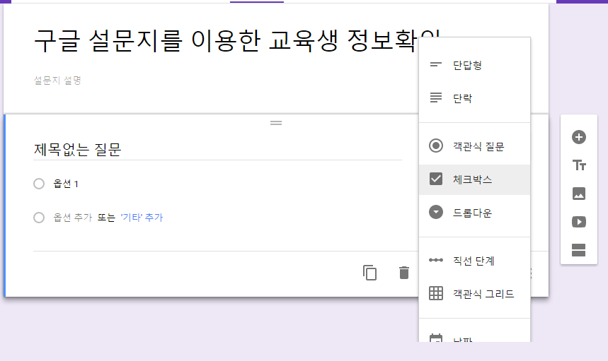 닫기를 누르면 이렇게 설문지가 뜬다.연필 모양을 눌러 원하는 설문지로 수정하면 된다.
